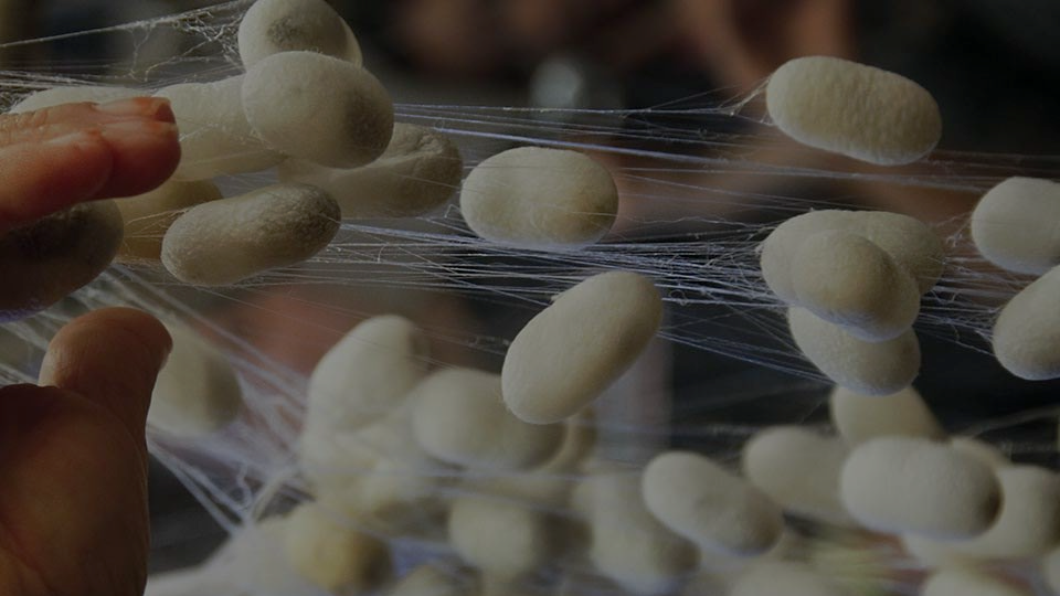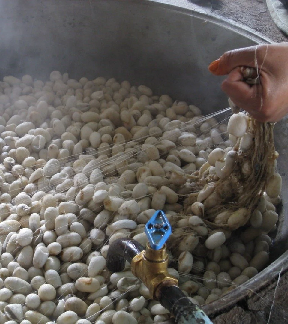 The cocoons are placed into boiling water to soften and dissolve the gum that is holding the cocoon together.