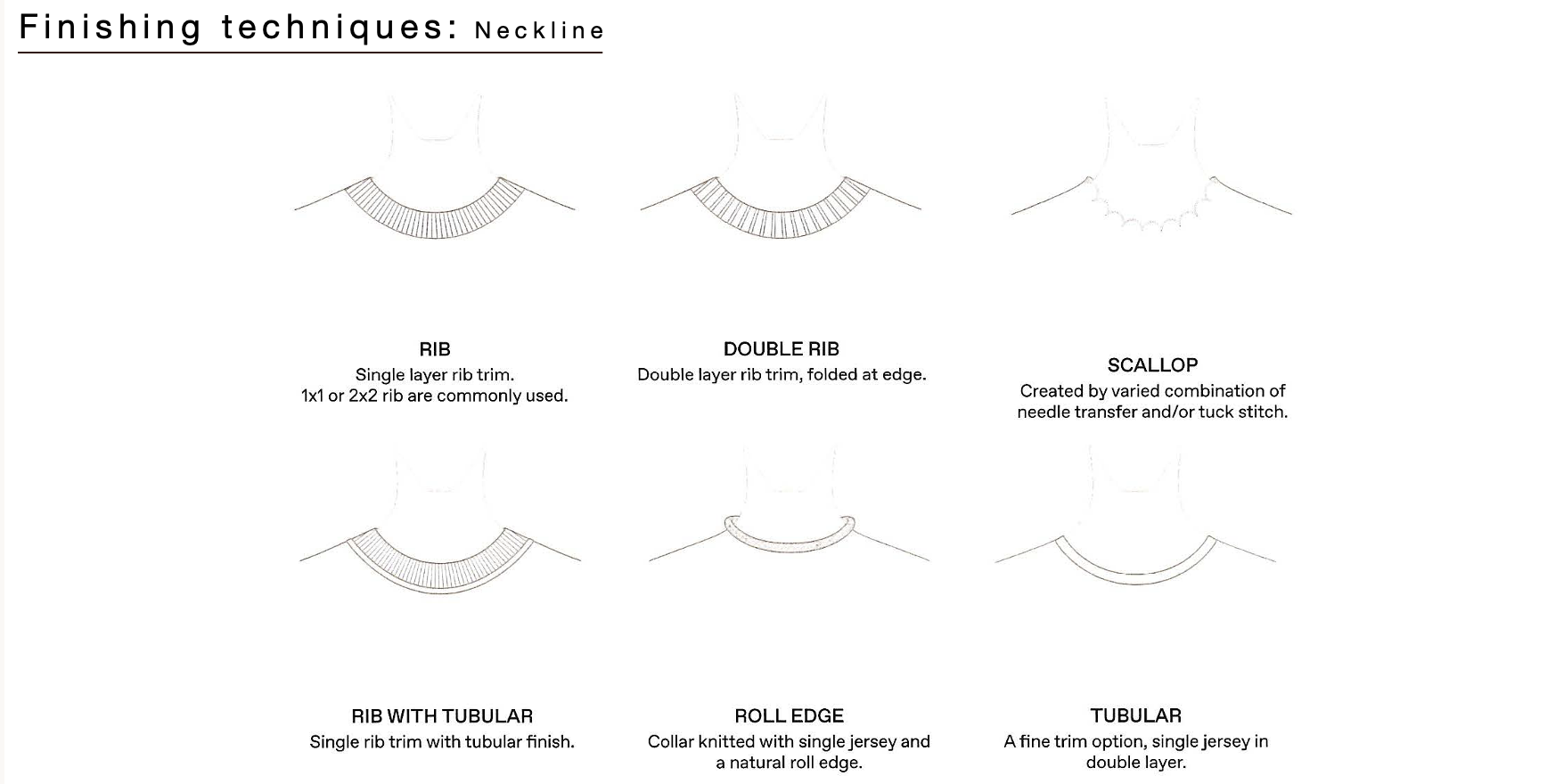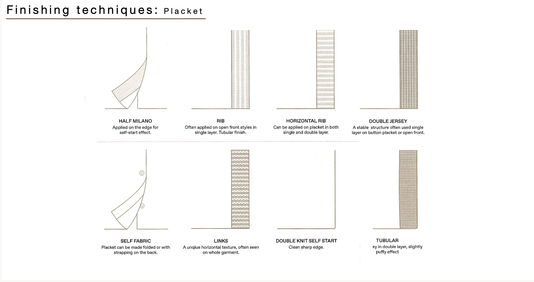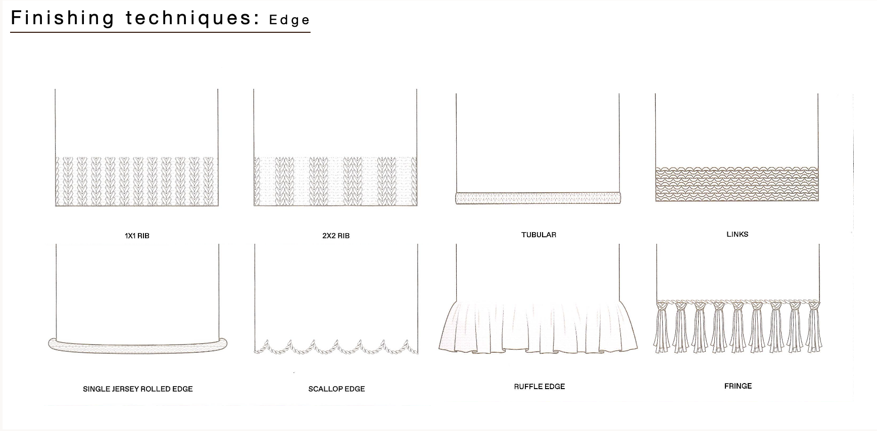 SECTION 2kNITTING TECHNIQUESDefining a stitchEssential stitchesStructures on single and double bedFinishing techniquesGarment knittingOperational range of knittingBasics of machine knittingGauges and tensionKnitting faults NECK FINISHING Rib Roll Tubular Scallop Links Half milano Rib Double jersey Tubular PLACKET FINISHING Self fabric Links links Double knit seld start EDGE FINISHING Rib Single jersey rolled edge Scallop edge Tubular Links Ruffle edge Fringe < Structures on single and double bed Overview Garment knitting >