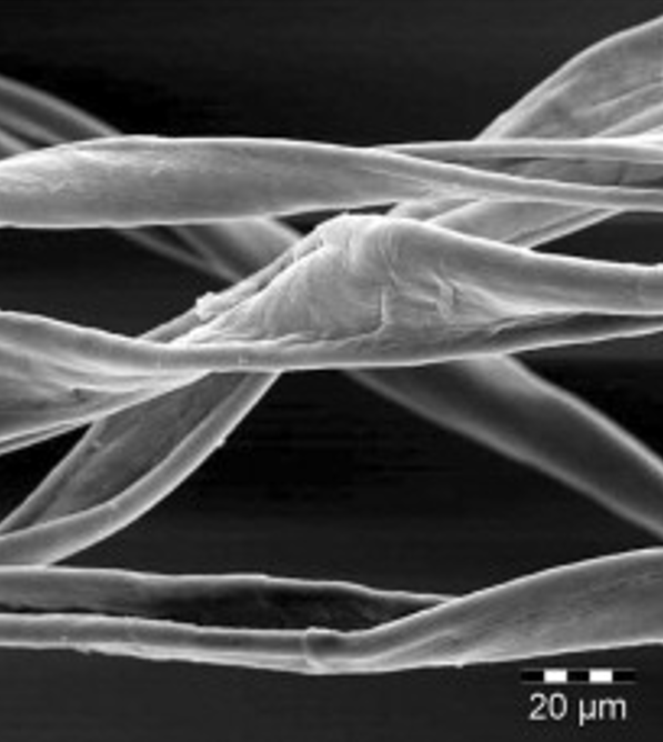 • Long, irregular filaments with rough texture and nodes • Porous → absorbent