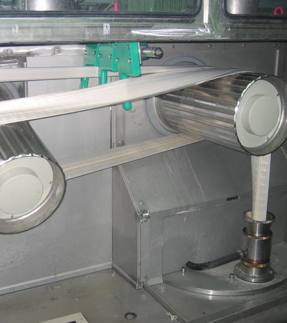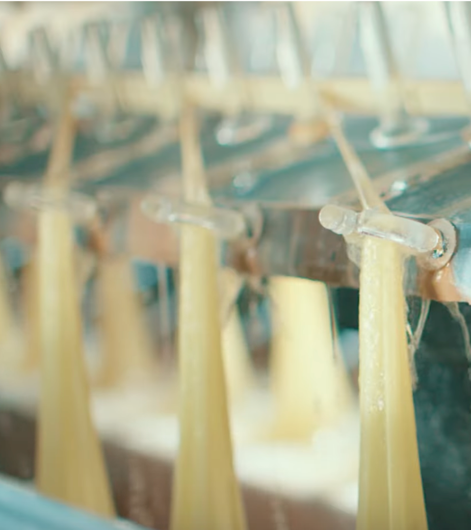 The solution is extruded via spinnerets to create continuous filaments.