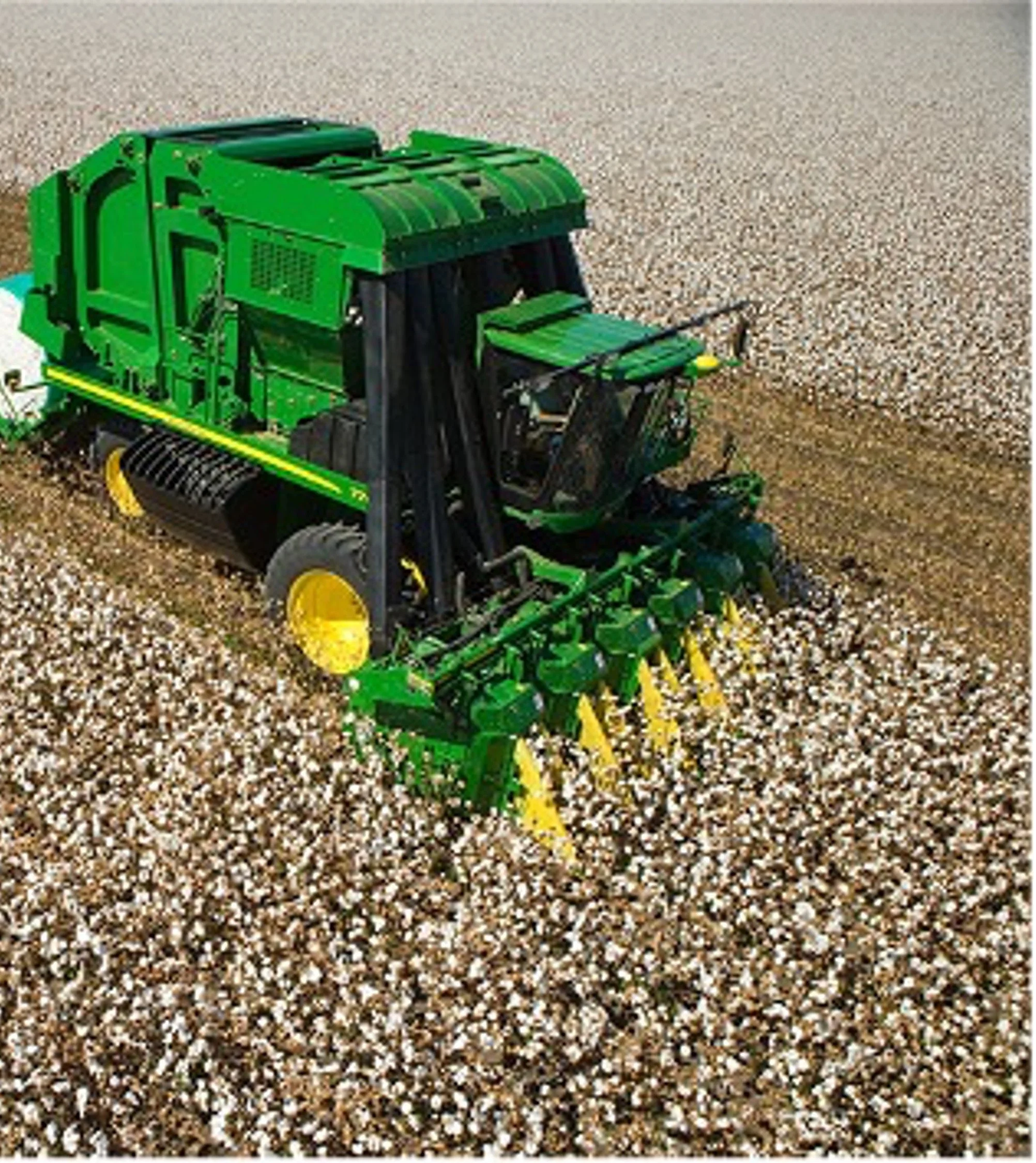Cotton pickers pluck the cotton bolls from the plants and harvest them in large bales