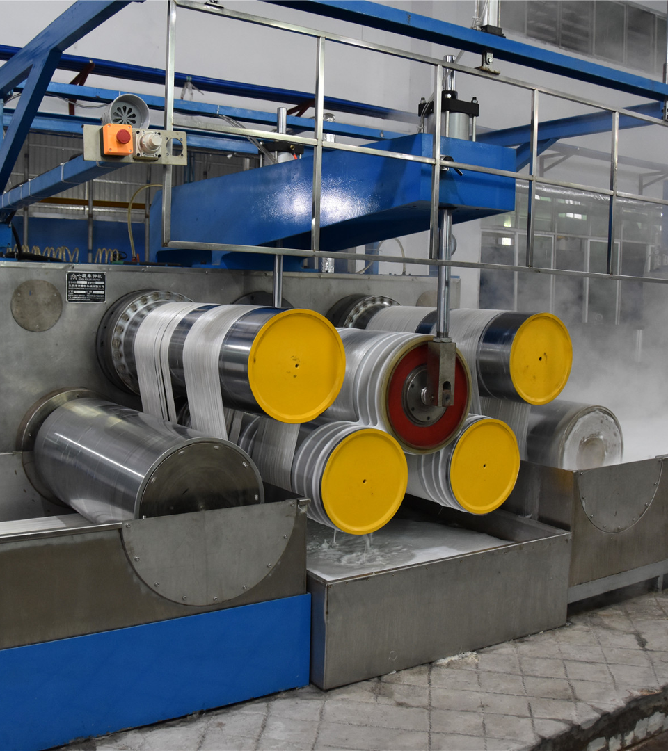 The solution is extruded via spinnerets to create continuous filaments.
