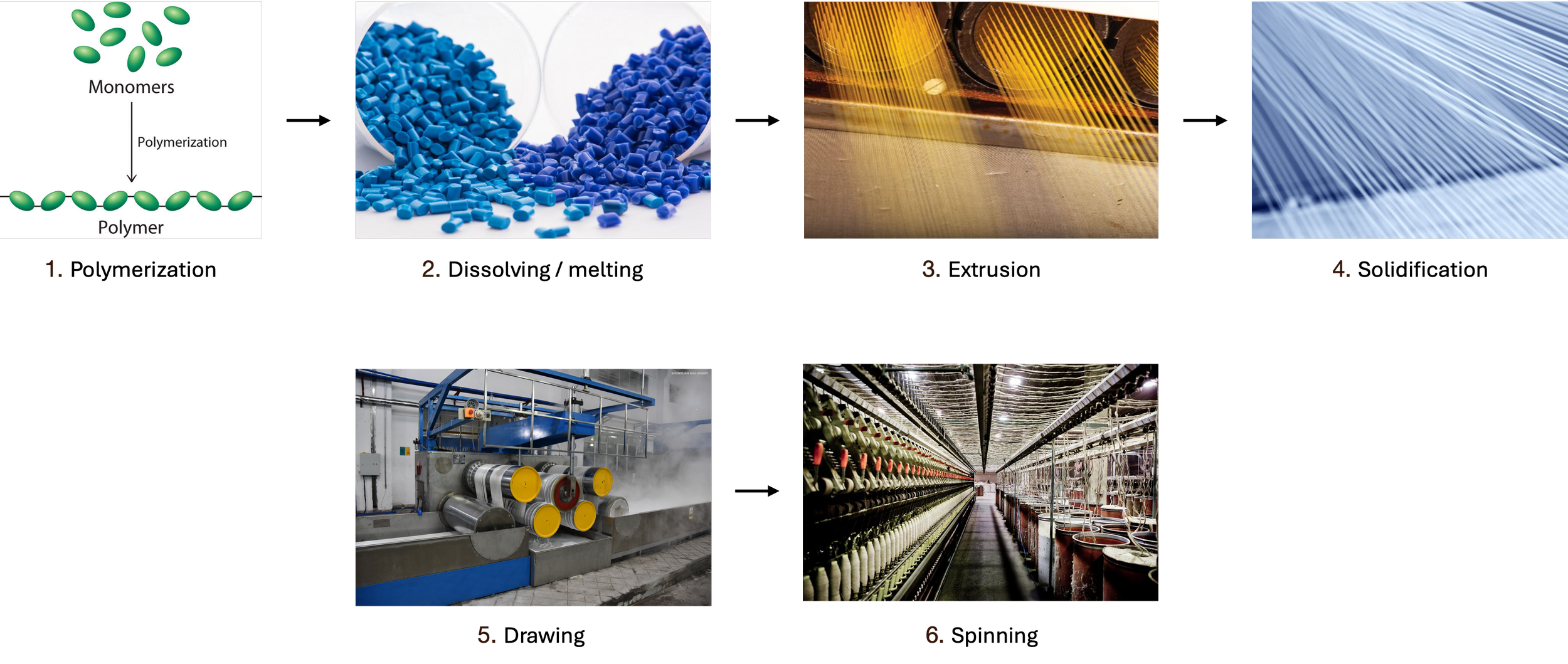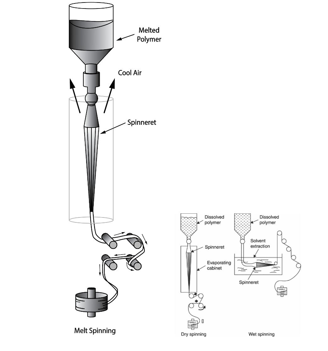 • Polymer granules are melted and then extruded through the spinneret