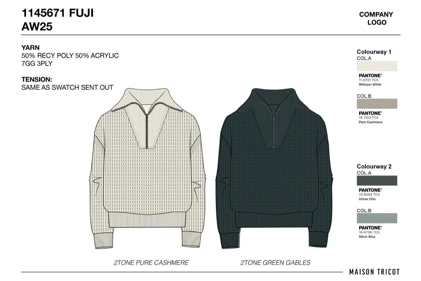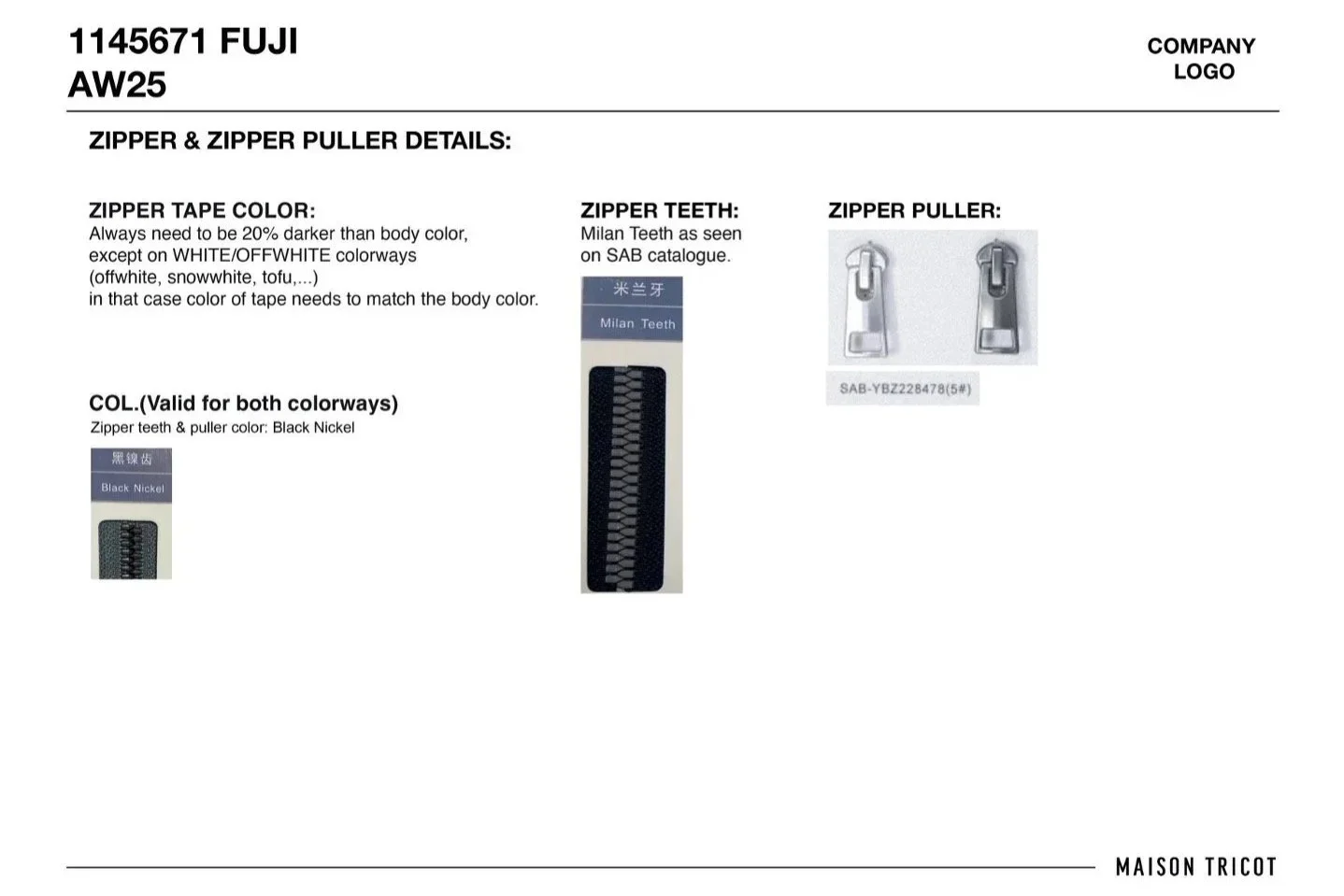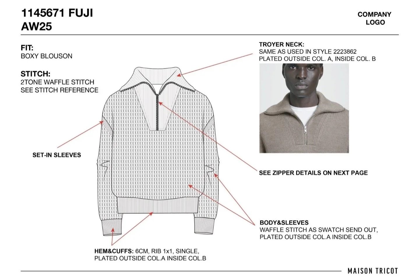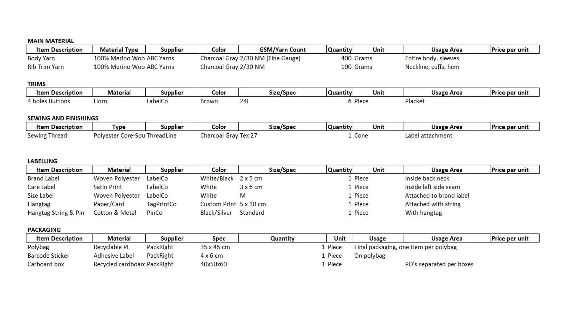 • Lists materials, yarns, trims, labels, buttons, zippers, etc.