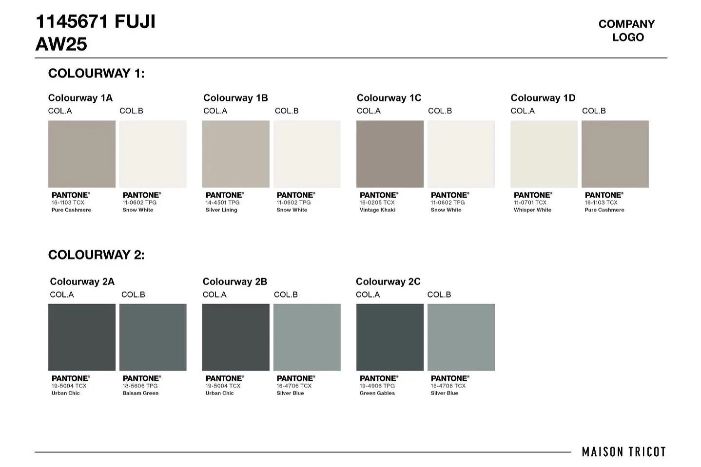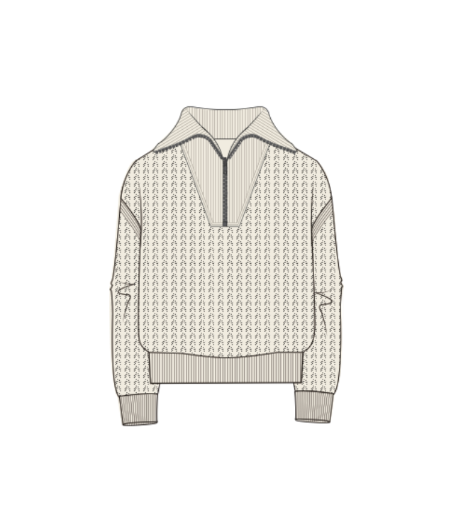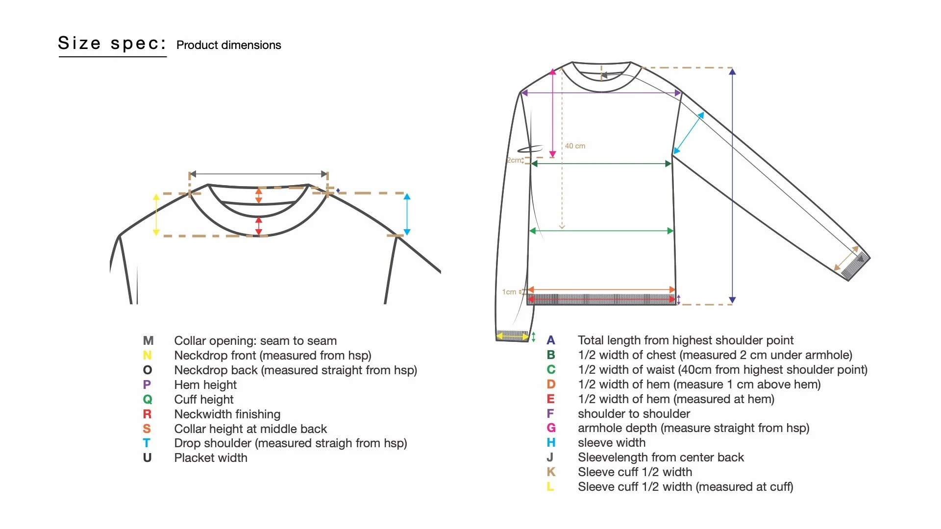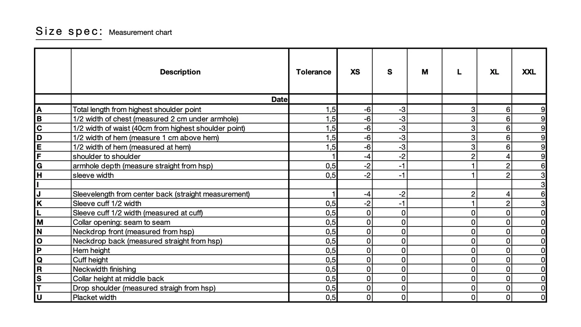 • Lists materials, yarns, trims, labels, buttons, zippers, etc.
