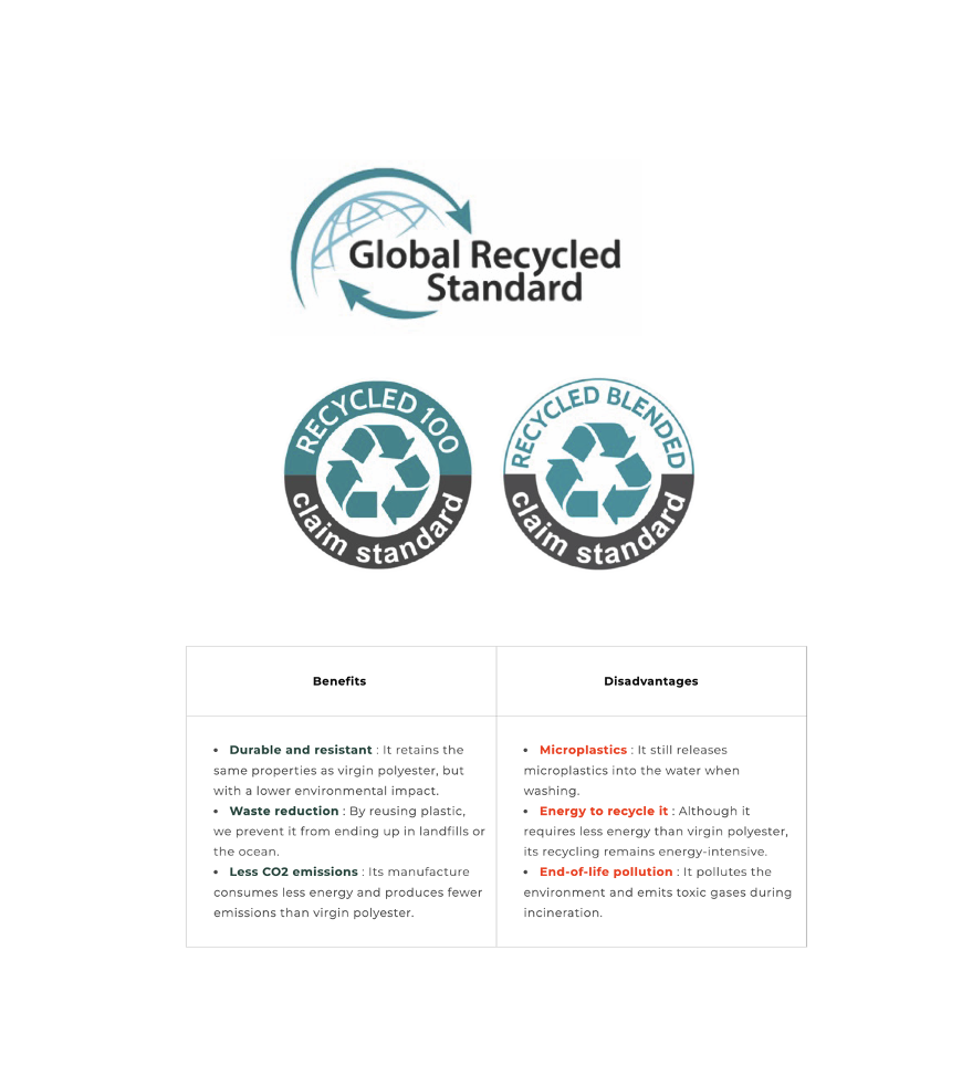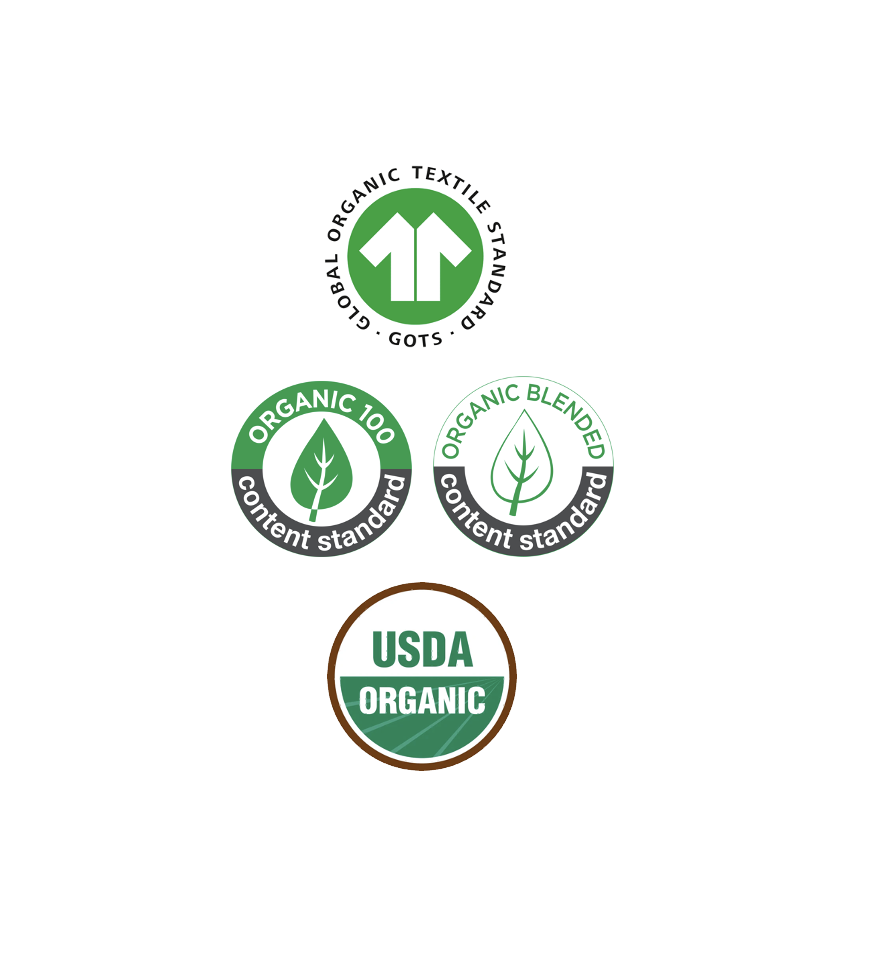 •Organic certification: lower impact GOTS, USDA organic, organic content, organic blend content •Can be chemically or mechanically recycled